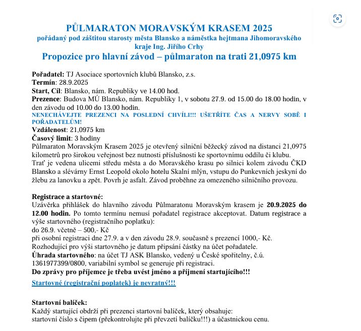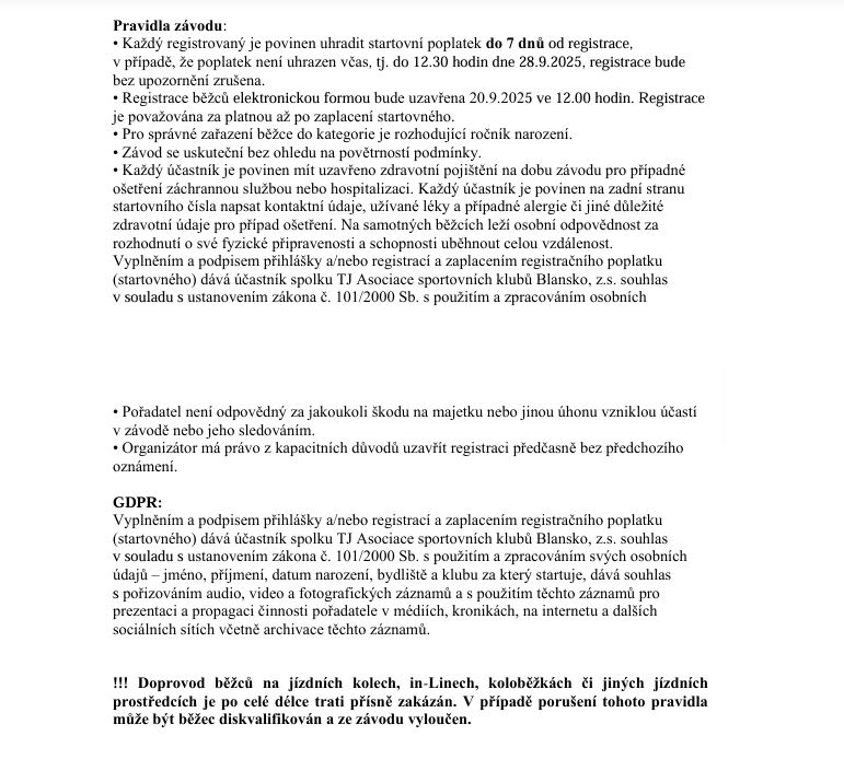 Startovné na místě: | 1000 Kč, po 20. 9. nemusí pořadatel registrace akceptovat |