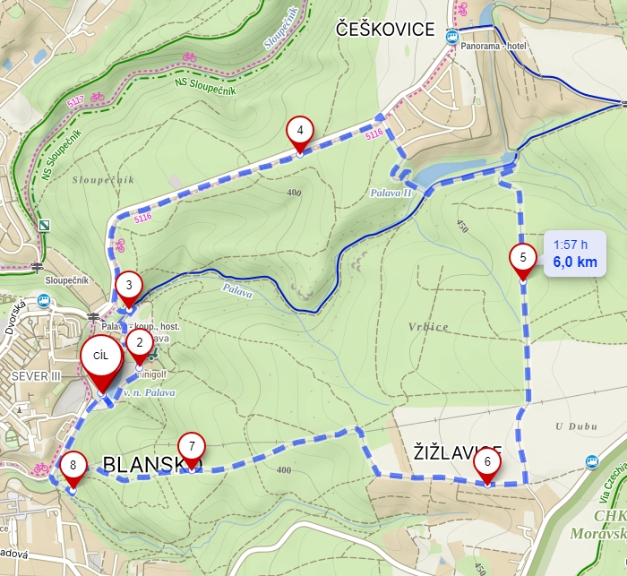 | Popis trati: | trať vede z Blanska od přehrady Palava po chodníku do Češkovic, kolem přehrady Palava II a lesními cestami kolem Žižlavic zpět na hráz přehrady Palava |